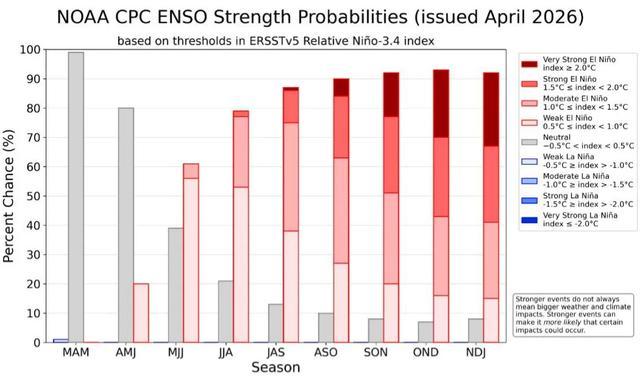 当下NOAA给出的趋势已经非常明显了,预计在2026年5月至7月期间,厄尔尼诺现象可能会出现,有61%的概率发展出来,并且至少持续到2026年底,我国气候中心也发布了说明,那就是今年春季后期可能进入厄尔尼诺状态。